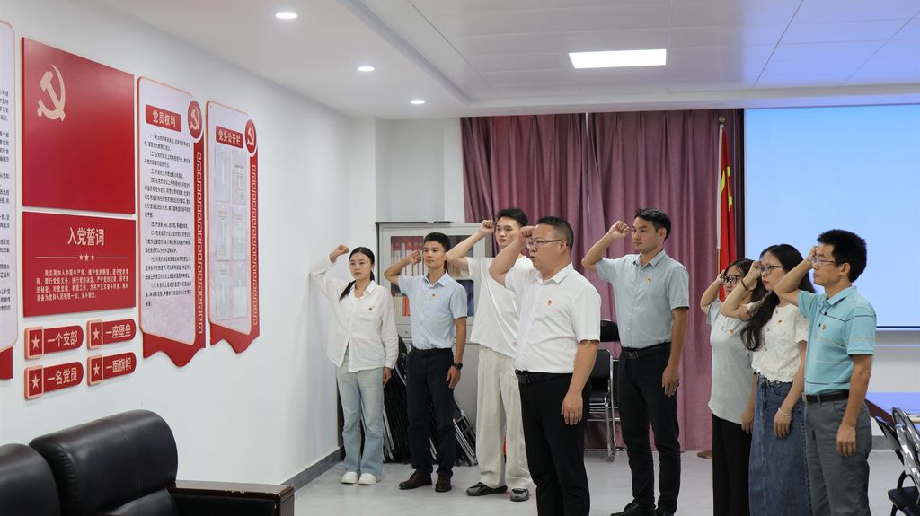 在鲜红党旗下,全体党员高举右拳重温入党誓词,铿锵誓言回荡会场,每一位党员都在宣誓中回溯初心使命。