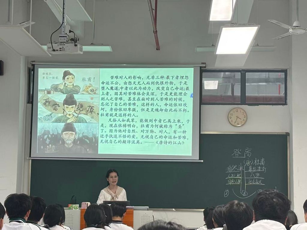 语文科组刘婷老师以杜甫《登高》为教学载体,开启首场示范。课堂打破传统古诗文教学模式,巧妙融入动画电影《长安三万里》片段,用动态画面还原盛唐背景与杜甫的人生境遇,带领学生沉浸式走进“风急天高猿啸哀”的萧瑟意境。教学中,刘老师通过分层诵读、文本细研、情感共鸣三重环节,从意象解析到“万里悲秋常作客”的沉郁情感挖掘,逐步引导学生把握诗歌韵律与诗人忧国忧民的情怀,实现“鉴赏方法+情感体悟”的深度融合,为古诗文教学提供了可复制的创新范式。