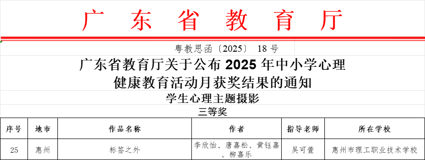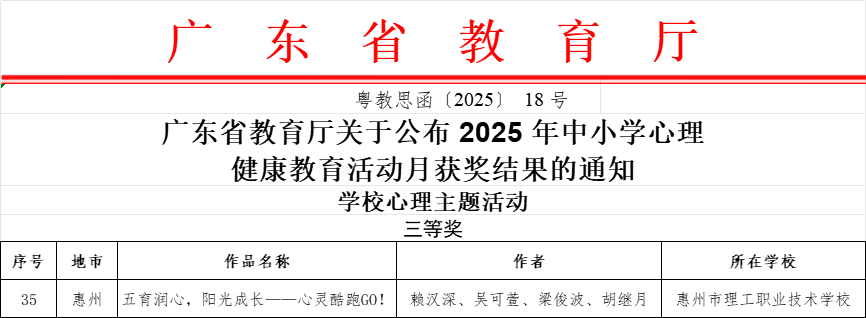 惠州理工学校心理健康教育工作喜报:《五育润心,阳光成长》系列活动喜获省市殊荣