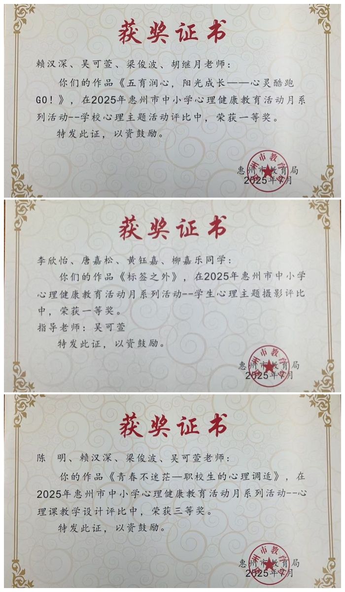 在2025年省、市中小学心理健康教育活动月评选中,我校凭借系统性的心理育人体系与富有创新性的教育实践,荣获惠州市一等奖与广东省三等奖!