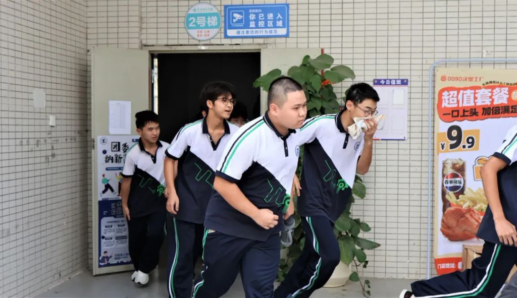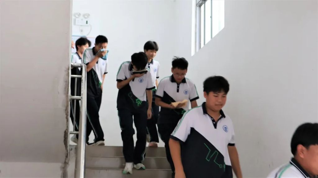 信号响起后,全体师生迅速响应,按照预设方案弯腰低姿、捂住口鼻,快速且有序地撤离教学楼、宿舍等场所,在指定集合点完成清点集结。整个过程紧张高效、衔接顺畅,充分展现了师生良好的应急素养。