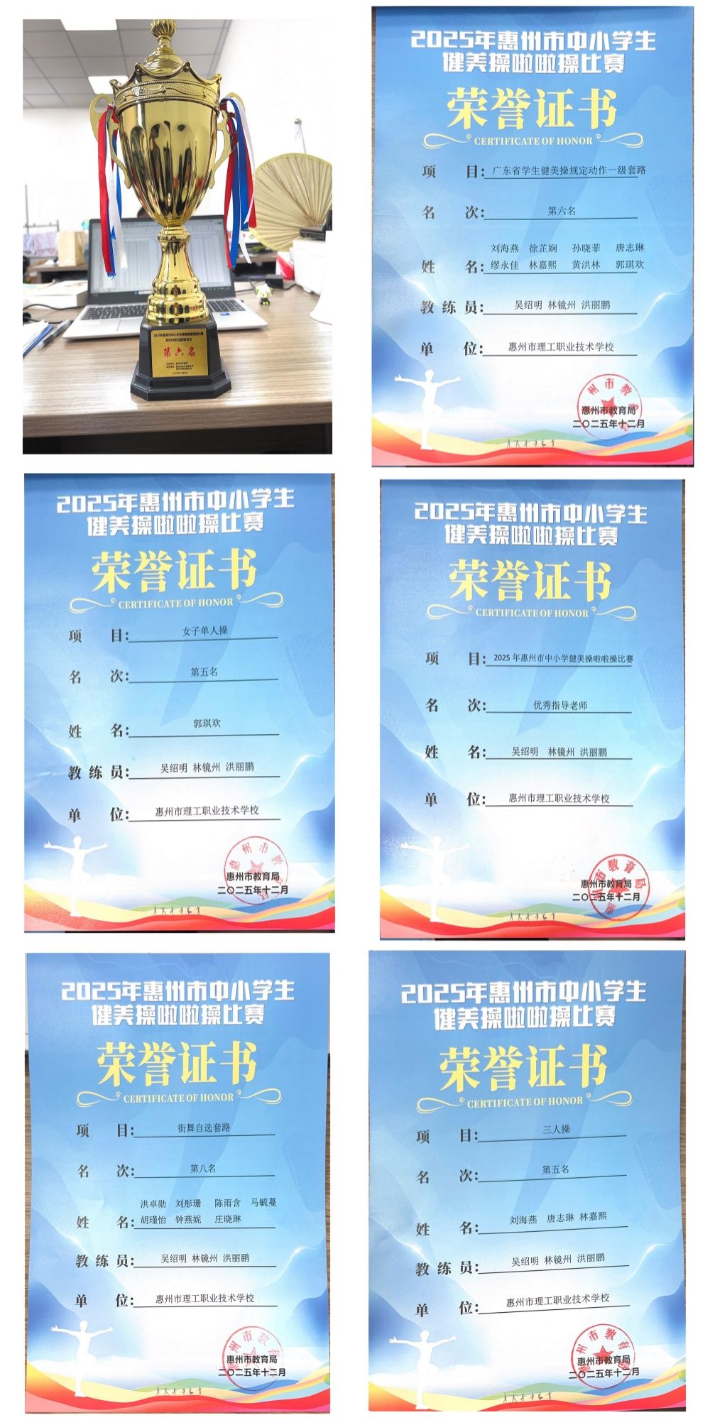 近日,2025年惠州市中小学生健美操啦啦操比赛落下帷幕,惠州市理工职业技术学校代表队表现优异,一举斩获团体与个人多个奖项,特此表彰,共贺荣誉时刻。吴绍明、林镜州、洪丽鹏三位老师获评“优秀指导老师”。学校成功摘得高中(中职)组团体总分第六名的佳绩。郭琪欢同学获“女子单人操第五名”。刘海燕、唐志琳、林嘉熙获“三人操第五名”。刘海燕、徐芷娴、孙晓菲、唐志琳、缪永佳、林嘉熙、黄洪林、郭琪欢8名同学获“广东省学生健美操规定动作一级套路第六名”。洪卓勋、刘彤珊、陈雨含、马毓蔓、胡瑾怡、钟燕妮、庄晓琳7位同学获“街舞自选套路第八名”。
